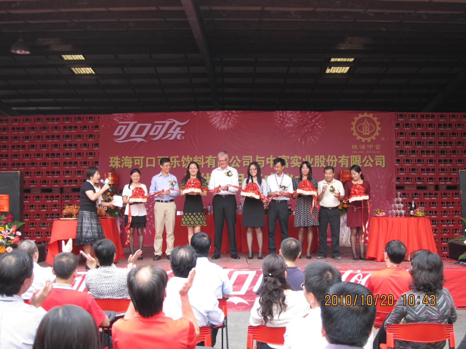 落成典禮剪彩儀式當(dāng)天出席的有珠??煽诳蓸凤嬃嫌邢薰镜挠嗫偂㈨f總,珠海中富實(shí)業(yè)股份有限公司董事長(zhǎng)GARY及王總經(jīng)理等雙方中高層領(lǐng)導(dǎo)及員工代表共有60余人。本次活動(dòng)儀式在可口可樂公司舉行。