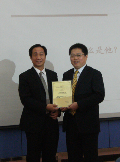 (左:頒獎嘉賓中國人民大學(xué)信息資源管理學(xué)院副院長張斌教授 右:2009年知識管理人物韓建新)